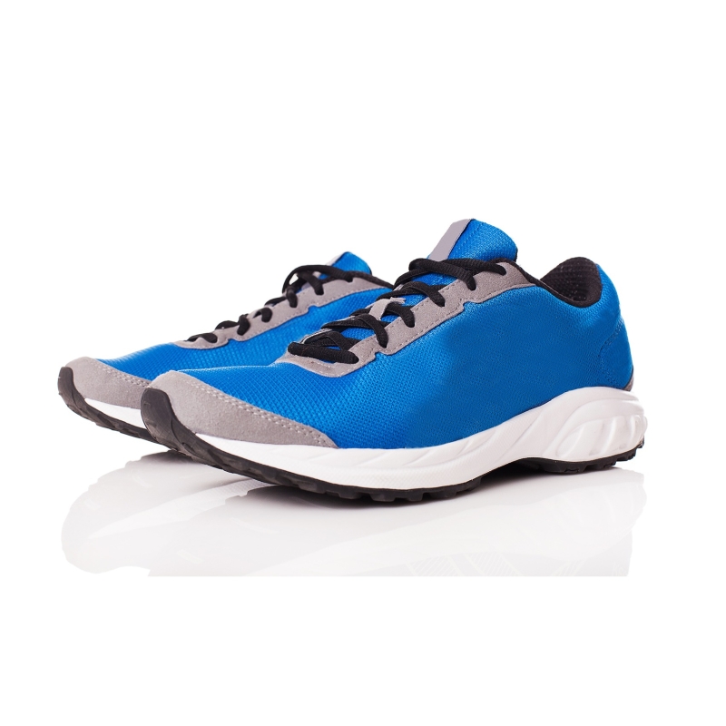 زوج من أحذية الجري الزرقاء ، مع تصميم منتظم ، تفاصيل الأربطة