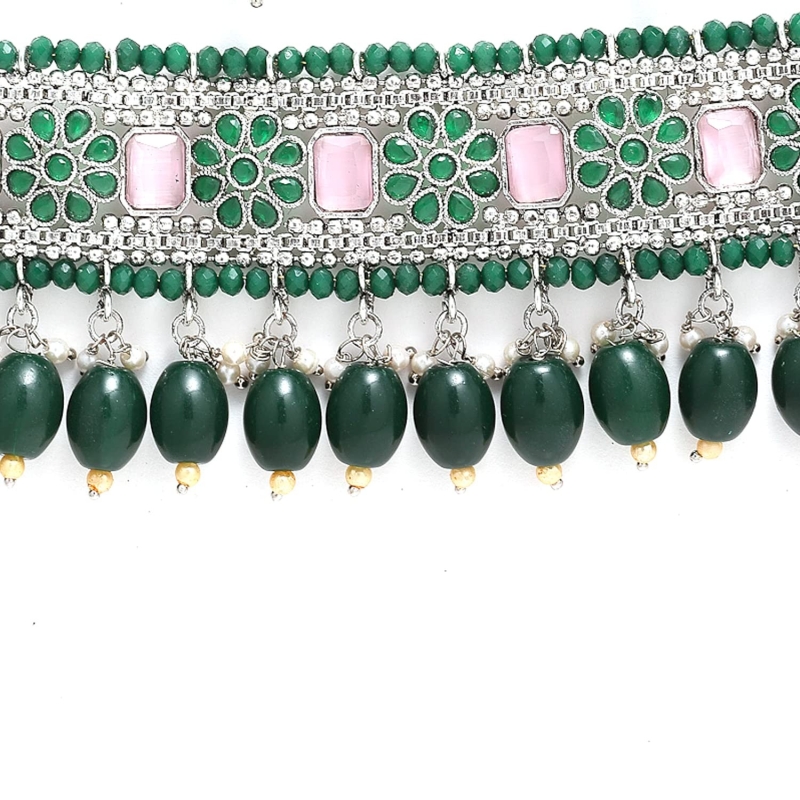 قلادة قلادة قلادة تقليدية مرصعة بالحجر باللون الأخضر والوردي مطلية بالفضة مع أقراط مجوهرات