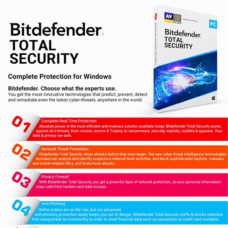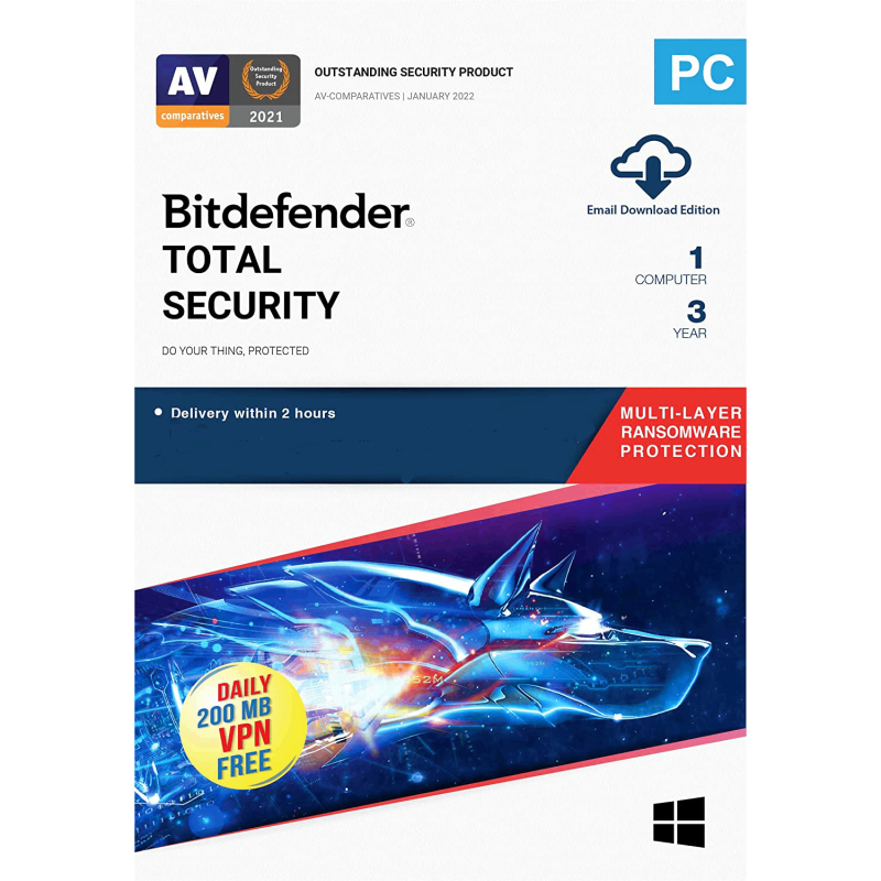 • Multi-Layer Ransomware Protection with Bitdefender Safe Files, Bitdefender VPN(200 MB free daily traffic), video & audio protection, Ransomware Remediation, Anti Tracker.